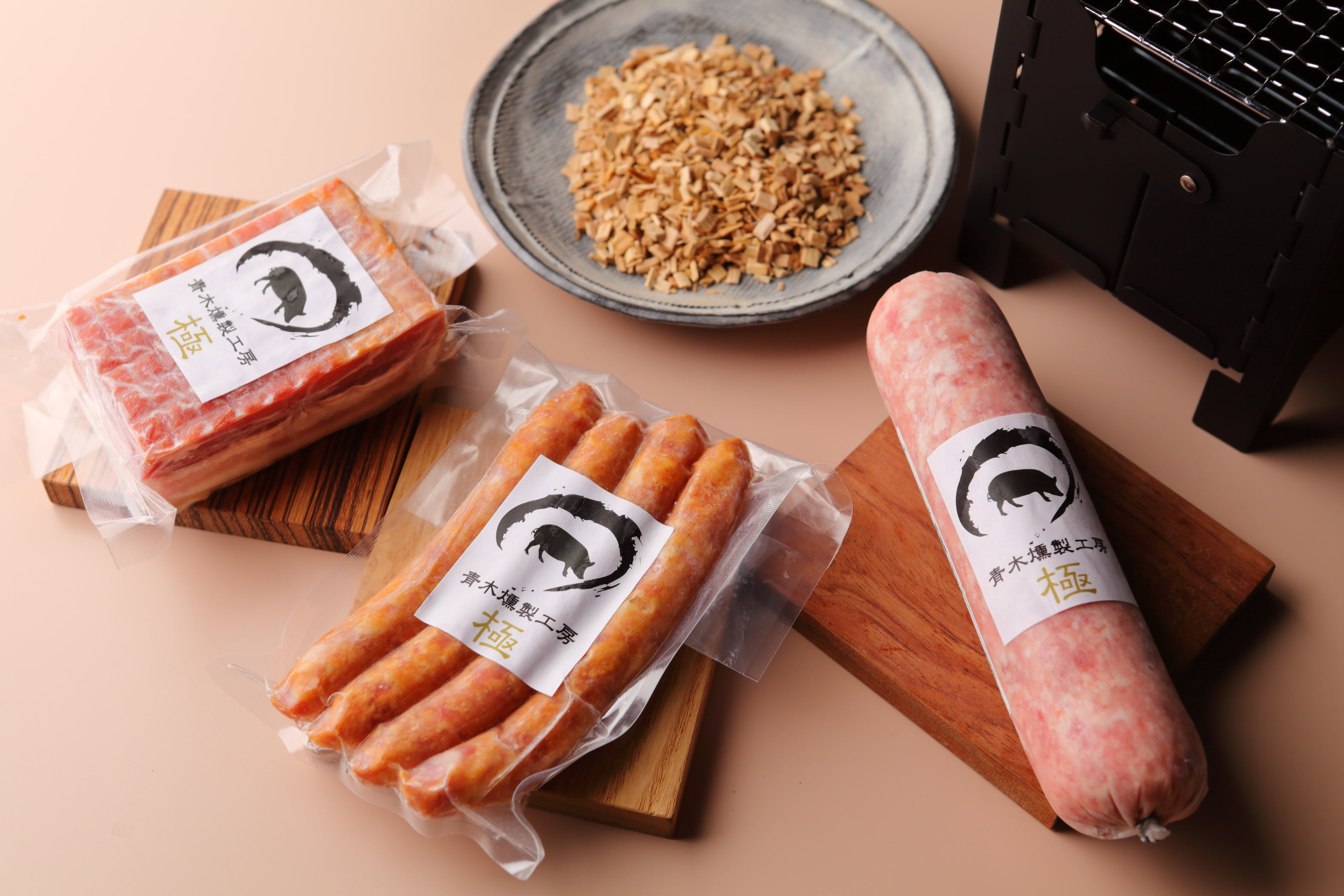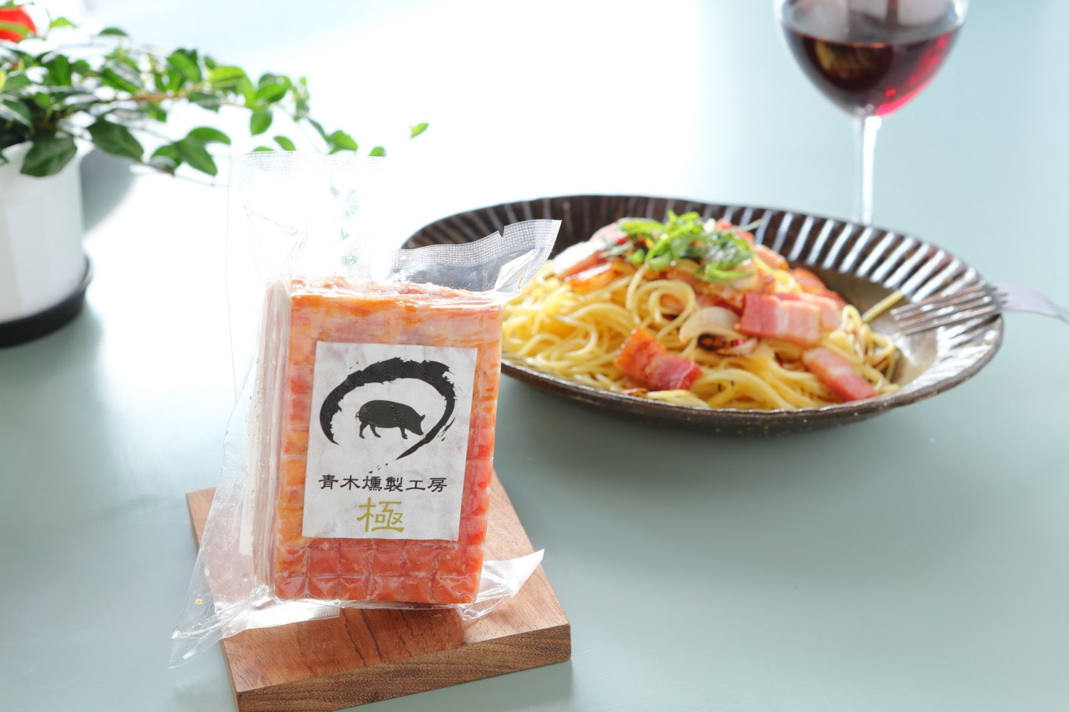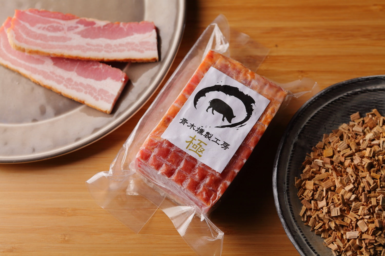 お水を一切使わずに、オリジナルスパイスを丁寧にすりこんで脂の甘味を引き出して作り上げた本格的なベーコンです。国産の山桜のチップを使用し、遠赤したバラ肉を熟成させることにより、独特な香りをまとったベーコンに仕上がります。国産にこだわっておりますが、ベーコンに関しましては、デンマーク産のベリーを使用しております。加工品はやはりヨーロッパが強く、消費量も多いです。ベリーは加工品専門に育てられた豚になります。脂と赤身のバランスが非常に良いため、こだわって使用しております。カリカリに焼いてサラダのトッピングにしたり、厚めのスライスでベーコンステーキに、串に刺してベーコン串、ポトフに入れてもとても良い出汁が出ます。このベーコン1枚で様々な用途にご利用いただけます。